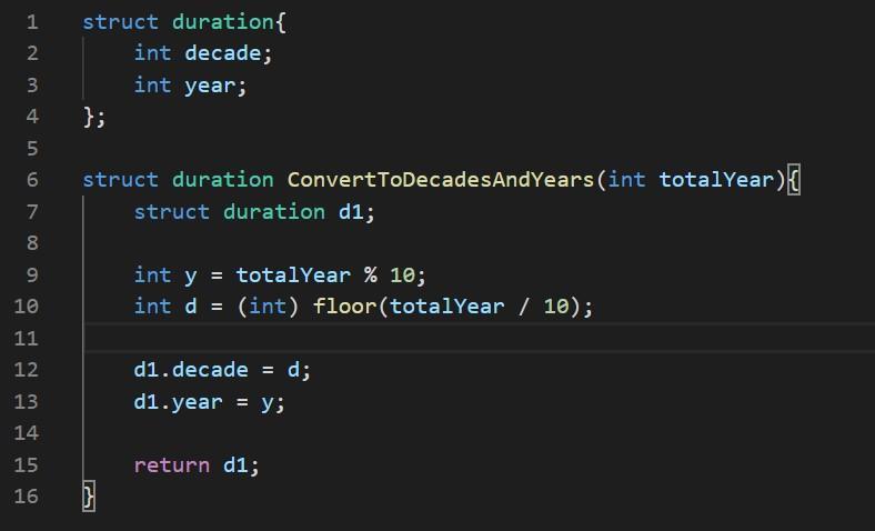 To return a struct data type from a function, we need to define the struct data in advance (Line 1 - 4). As required by the question, the <em>struct </em>duration consists of two members, <em>decade</em> & <em>year</em>.