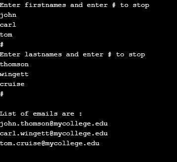 Two arrays are maintains which are f[] and l[]. f[] stores firstnames and l[] stores lastnames. First 2 loops are reading firstnames and lastnames which will break if '#' is typed as it is considered as a sentinel character here which is assured by checking the condition in the loop. Then n variable is used to store the length of the arrays. Both arrays have to be of equal length as email ids contains both firstname and lastname. Then a loop is created to print email ids of the format specified by using arrays f[] and l[].