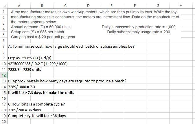 uous, the motors are intermittent flow. Data on the manufacture of the motors appears below.Annual demand (D) = 50,000 units Daily subassembly production rate = 1,000Setup cost (S) = $85 per batch Daily subassembly usage rate = 200Carrying cost = $.20 per unit per yearTo minimize cost, how large should each batch of subassemblies be?