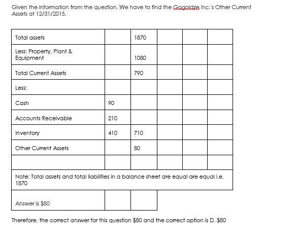 What was Gogoldze Inc.'s Other Current Assets at 12/31/2015?A. $710B. $120C. $370D. $80E. $790