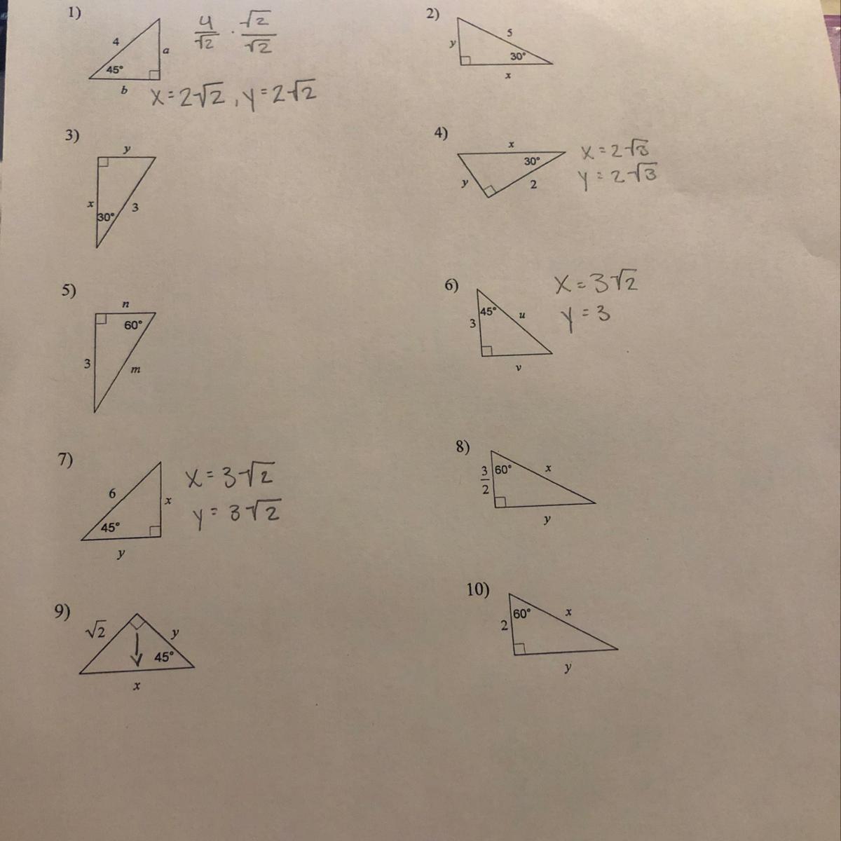Special right triangles find the missing side lengths. Leave your answers as radicals in simplest form. Need help ASAP due tomor