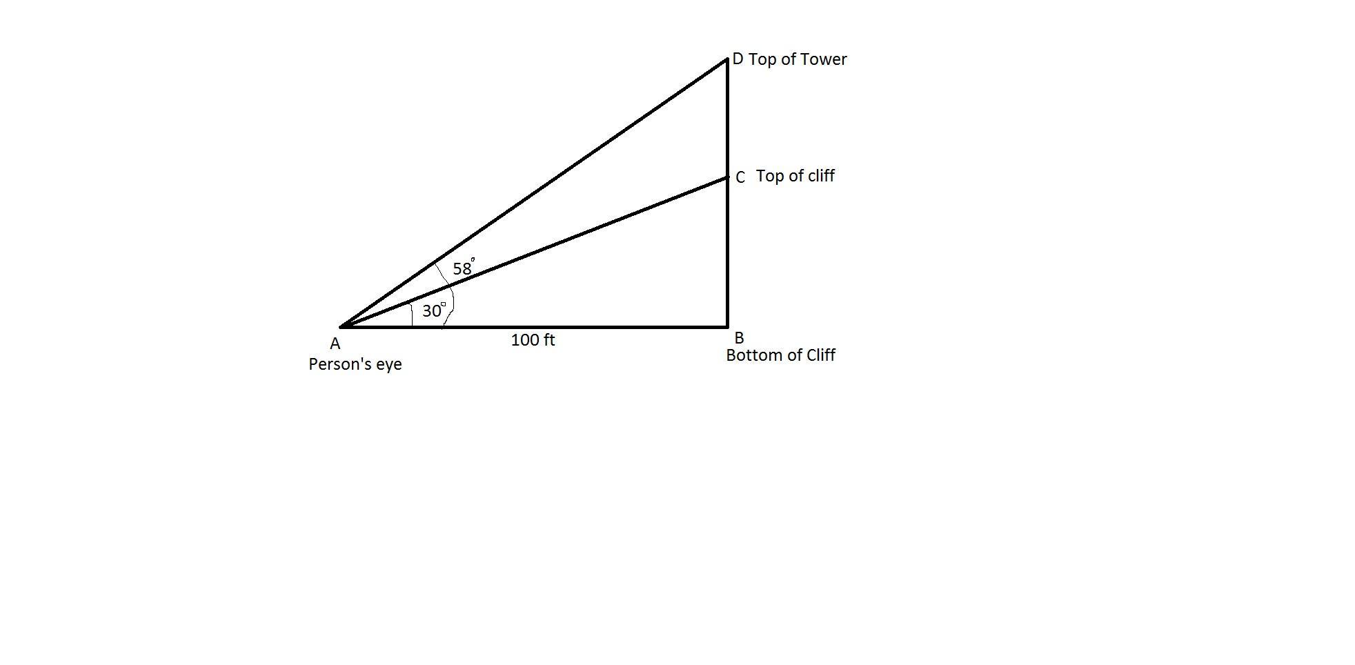 the top of the cliff is 30°, and the angle of elevation to the top of the tower is 58°. How tall is the tower?