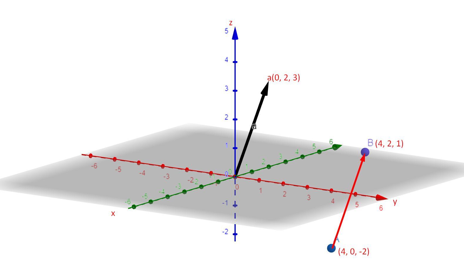 The vector AB with endpoints A(4, 0, -2) and B(4, 2, 1) is drawn below.
