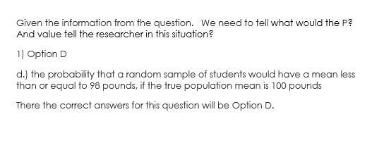 d.)the probability that a random sample of students would have a mean less than or equal to 98 pounds, if the true population mean is 100 pounds