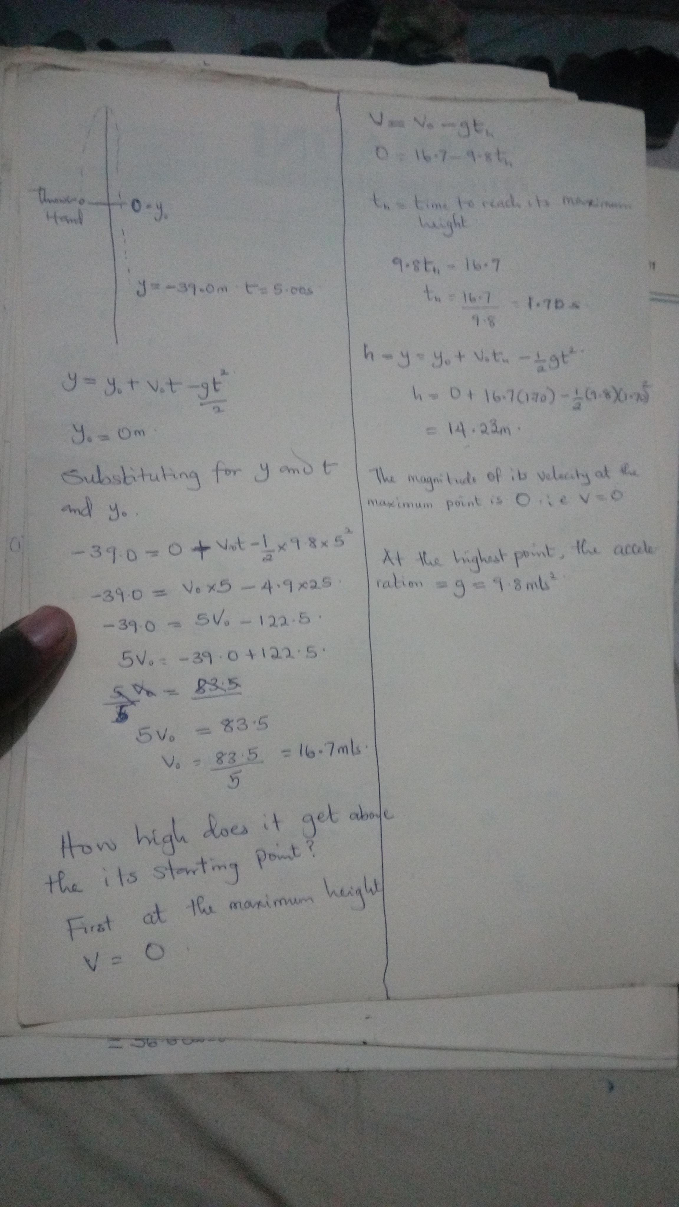 The highest point was calculated by first composure the time it took the egg to get the maximum height using the fact that when the egg gets to the highest point above the starting point it will temporarily be stationary having a zero velocity (v = 0). Taking advantage of this and setting v = to zero in the equation