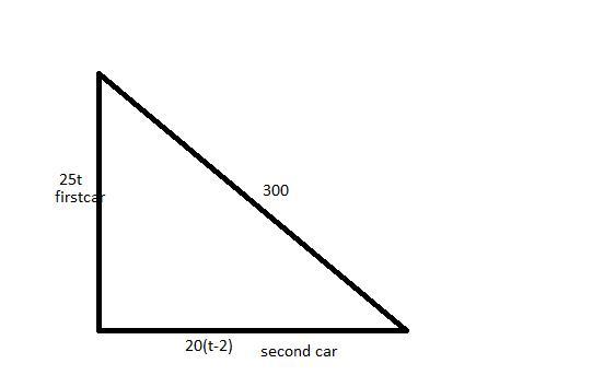How long after the first car starts traveling does it take the two cars to be 300 miles apart?