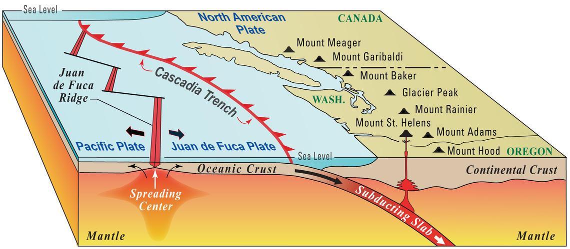 The Juan De Fuca plate is subducted by the North American plates .Through the subducted zone trenches are formed, magma are introduced through cracks and fissure causing volcanic eruption.