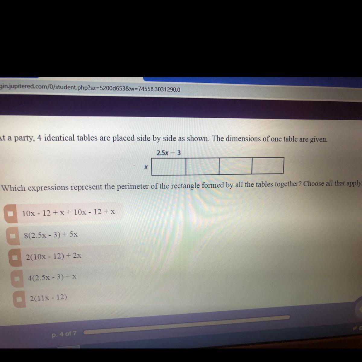 At a party, 4 identical tables are placed side by side as shown. The dimensions of one table are given.