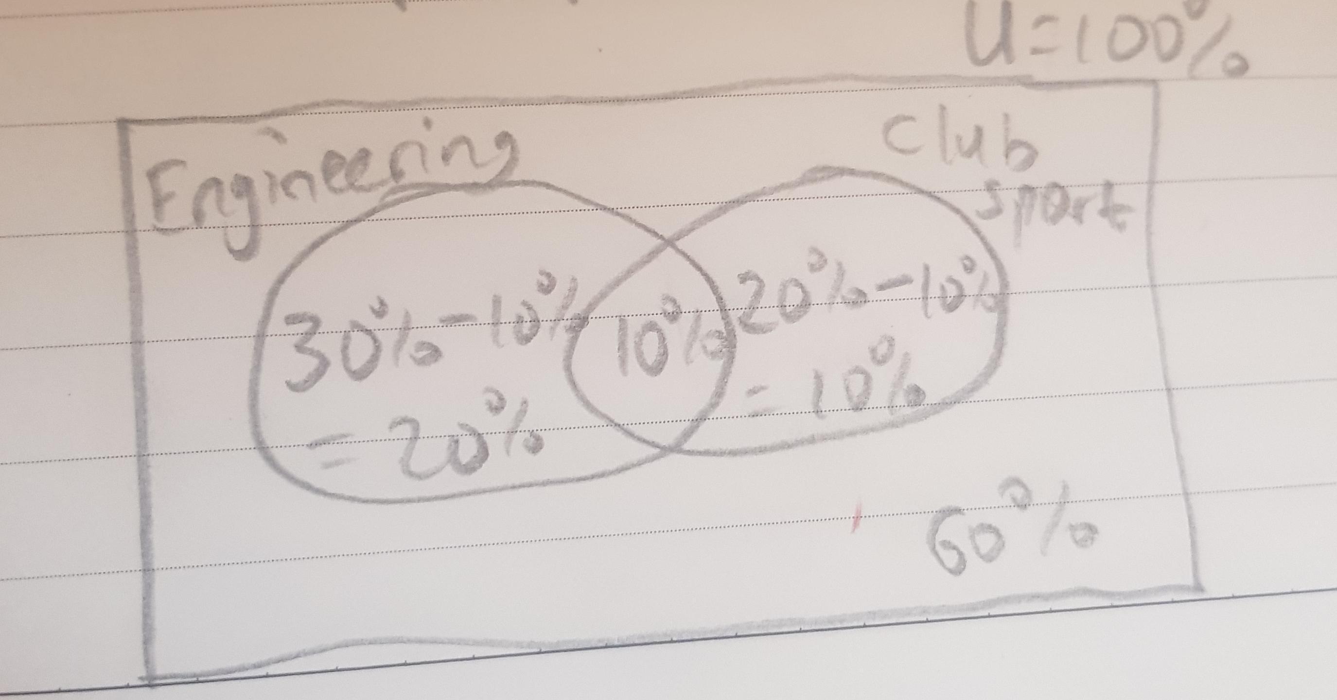 Percentage majoring in engineering & do not play club sport = 30 - 10 = 20% = 0.2