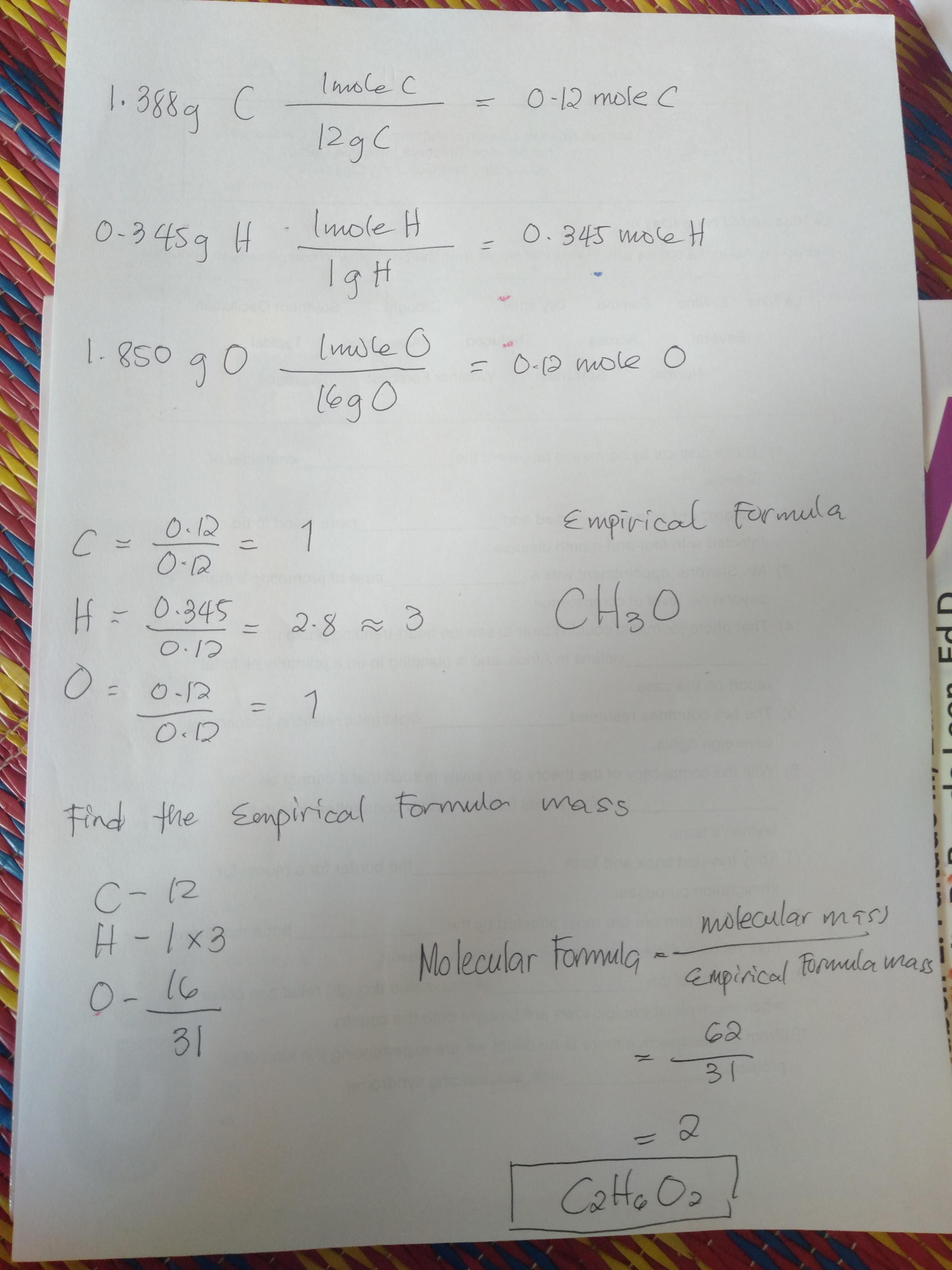 Sample (3.585g) contains 1.388g of C, 0.345g of H, 1.850g of O and its molar mass is 62g. What is the molecular formula of this
