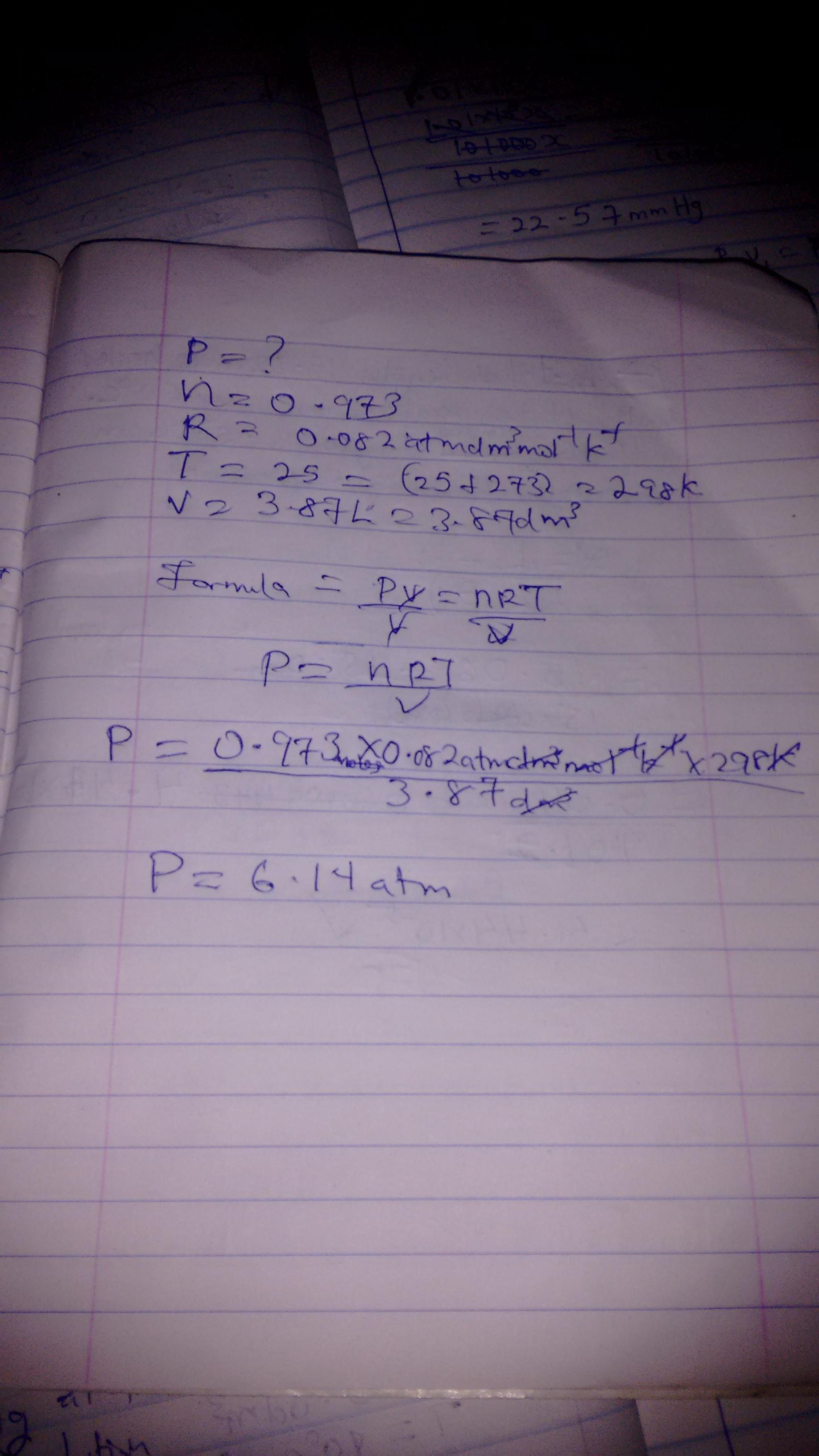 a 0.973 mole sample of helium gas at 25 degrees celsius filled a ballon to a volume of 3.87 L. what is the pressure of the ballo