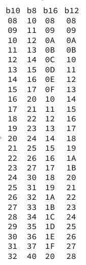 List the Octal and Hexadecimal numbers from 16 to 32. Using A and B as the last two digits (A representing a value of 10 and B r