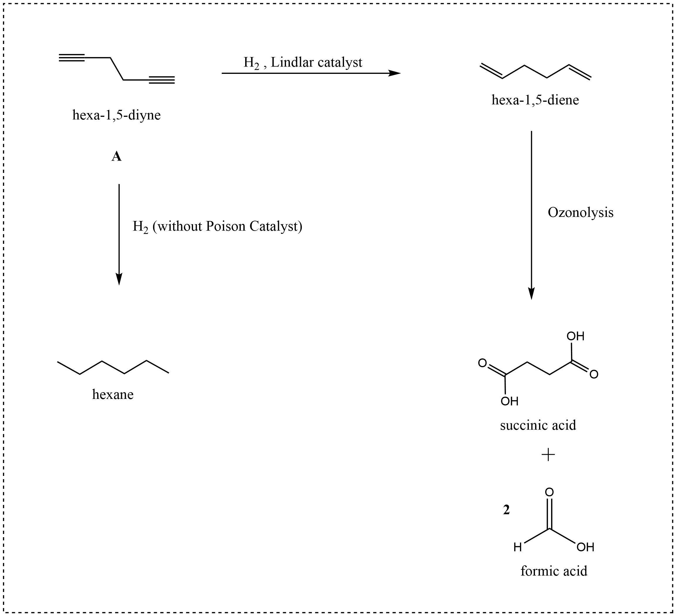 ysis followed by workup with aqueous H2O2 to yield succinic acid and two equivalents of formic acid. In the absence of a catalyst poison, hydrogenation of A gives hexane. Propose a structure for compound A.