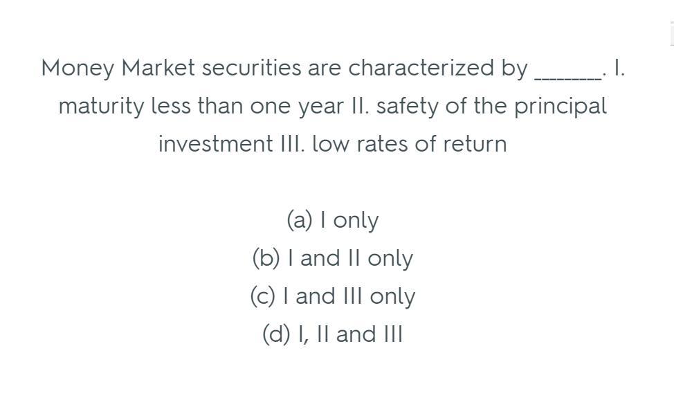 Money market securities are characterized by: I. Maturity less than 1 year II. Safety of the principal investment III. Low rates