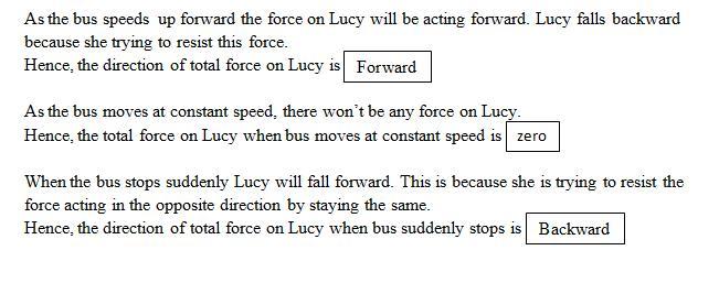 support pole. As the bus starts moving forward and picks up speed, Lucy holds the pole tightly to avoid falling over backward. While the bus is speeding up, what is the direction of the total force (if any) on Lucy?