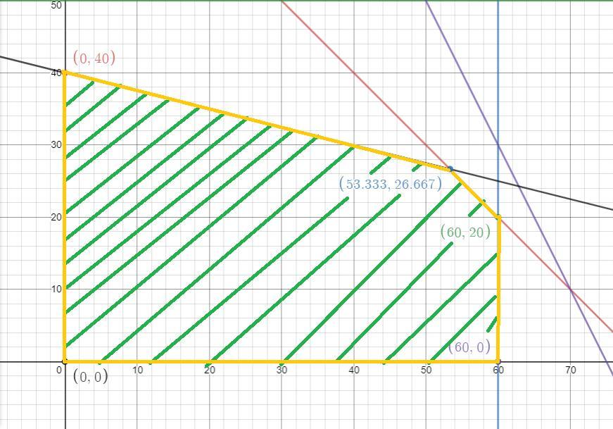so the possible extreme points are: (0,0), (0,40), (160/3, 80/3), (60,20), (60,0).