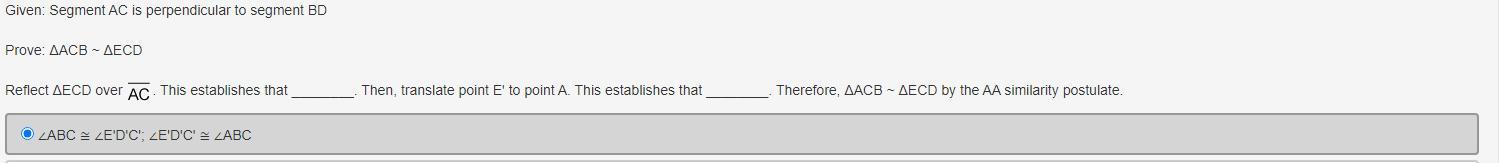 Since segment AC is perpendicular to segment BD (given) and the point C is their intersection point, when you reflect triangle ECD over the segment AC, you get: