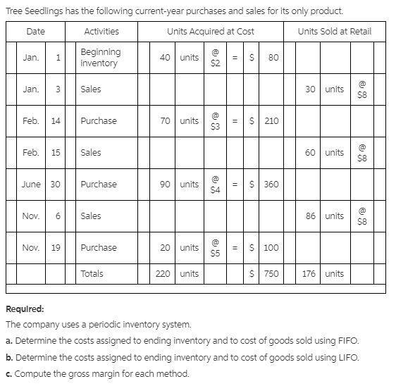 Tree Seedlings has the following current-year purchases and sales for its only product. The company uses a periodic inventory sy