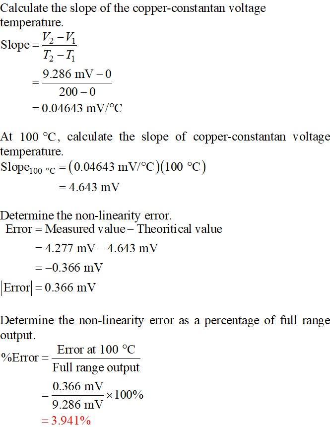 it is 4.277 mV and at 200°C it is 9.286 mV. What will be the non-linearity error at 100°C as a percentage of the full range output if a linear relationship is assumed between e.m.f. and temperature over the full range?
