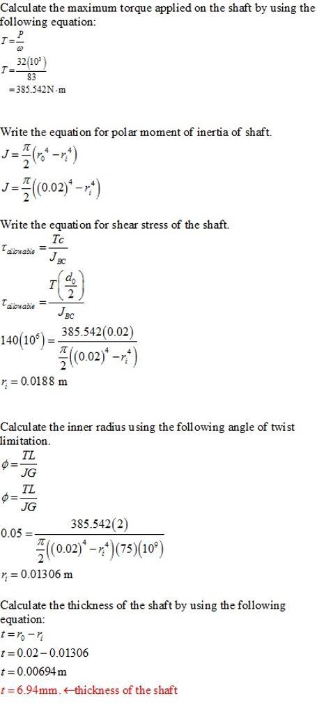 The A-36 hollow steel shaft is 2 m long and has an outer diameter of 40 mm. When it is rotating at 83 rad/s , it transmits 32 kW