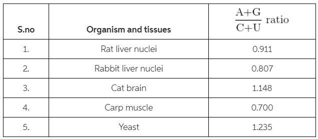 The purine to pyrimidine ratio in RNA with different bases is given below in the following table: