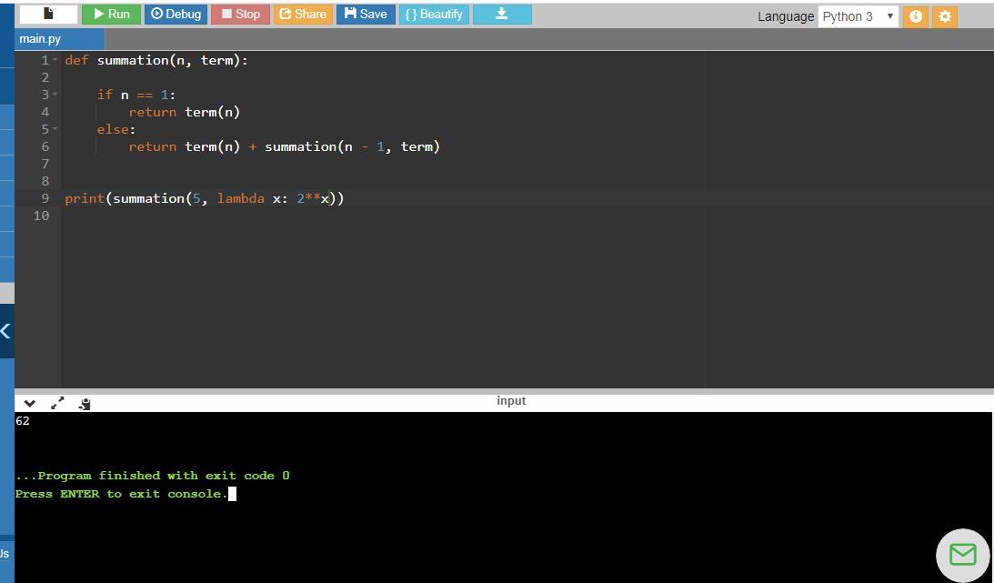 print(summation(5, lambda x: 2**x))