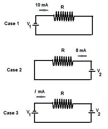 The voltage across the resistance is V₁ - V₂. Therefore the current I is given by