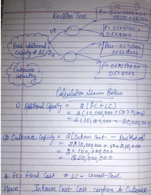 for servers has grown dramatically, the Santa Clara plant has reached capacity of 10,000 servers per year. Moon is considering two options to increase its capacity. The first option is to add 10,000 units of capacity to the Santa Clara plant at an annualized fixed cost of $10 million plus $500 labor per server. The second option is to have Molectron, an independent assembler, manufacture servers for Moon at a cost of $2,000 for each server (excluding raw materials cost). Raw materials cost $8,000 per server, and Moon sells each server for $15,000. Moon must make this decision for a two-year time horizon. During each year, demand for Moon servers has an 80 percent chance of increasing 50 percent from the year before and a 20 percent chance of remaining the same as the year before. Molectron’s prices may change as well. They are fixed for the first year but have a 50 percent chance of increasing 20 percent in the second year and a 50 percent chance of remaining where they are. Use a decision tree to determine whether Moon should add capacity to its Santa Clara plant or if it should outsource to Molectron. What are some other factors that we have not discussed that would affect this decision?