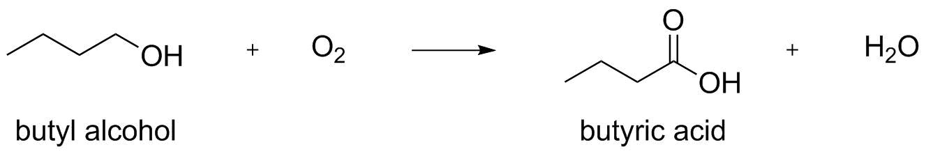 A common reaction is the formation of butyric acid from butyl alcohol. butyric acid is what causes the odor of rancid butter. ba