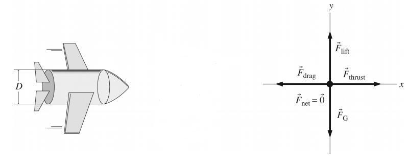 The net force is zero as the jet cruises at 230 m/s, so the thrust must be equal in magnitude to the drag. The  gravitational and lift forces are equal in magnitude and opposite in direction.