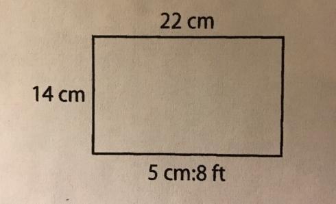 A scale drawing of a dance floor is has a length of 22 inch, a height of 14 cm, and has a scale of 5 cm: 8 ft. What is the area