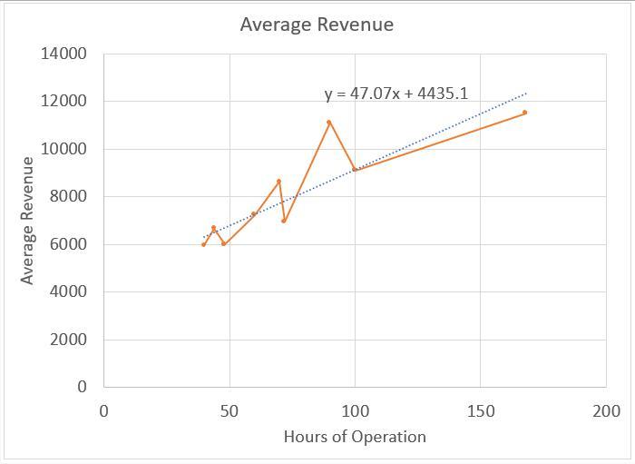 A. Use a linear function to represent the relationship between revenue and operating hours and find the best values of the parameters that provide the best fit to the given data. What revenue does your model predict for 120 hours?