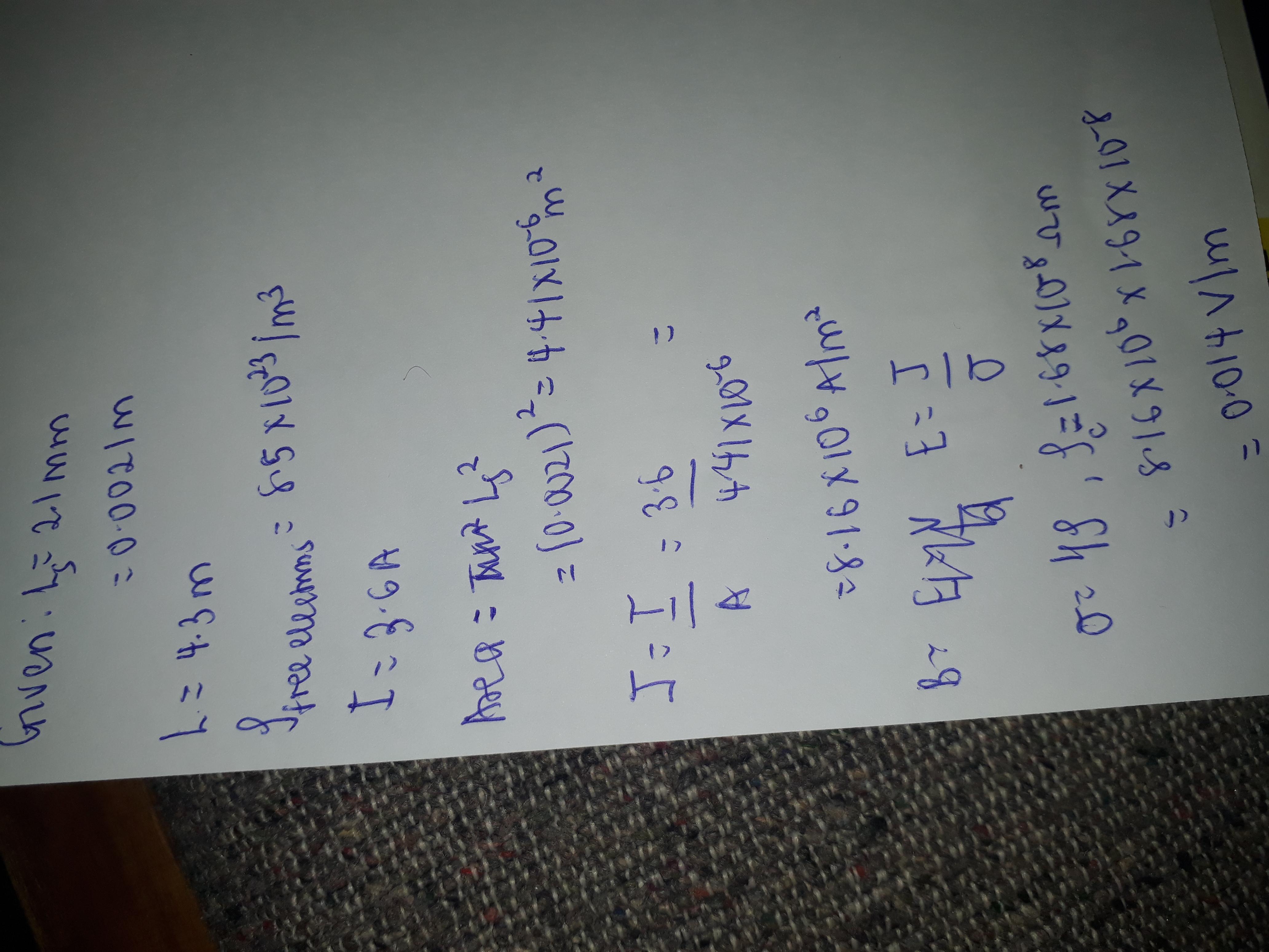 free electrons is 8.5 * 1028>m3 . Find the magnitudes of (a) the current density in the wire and (b) the electric field in the wire. (c) How much time is required for an electron to travel the length of the wire?