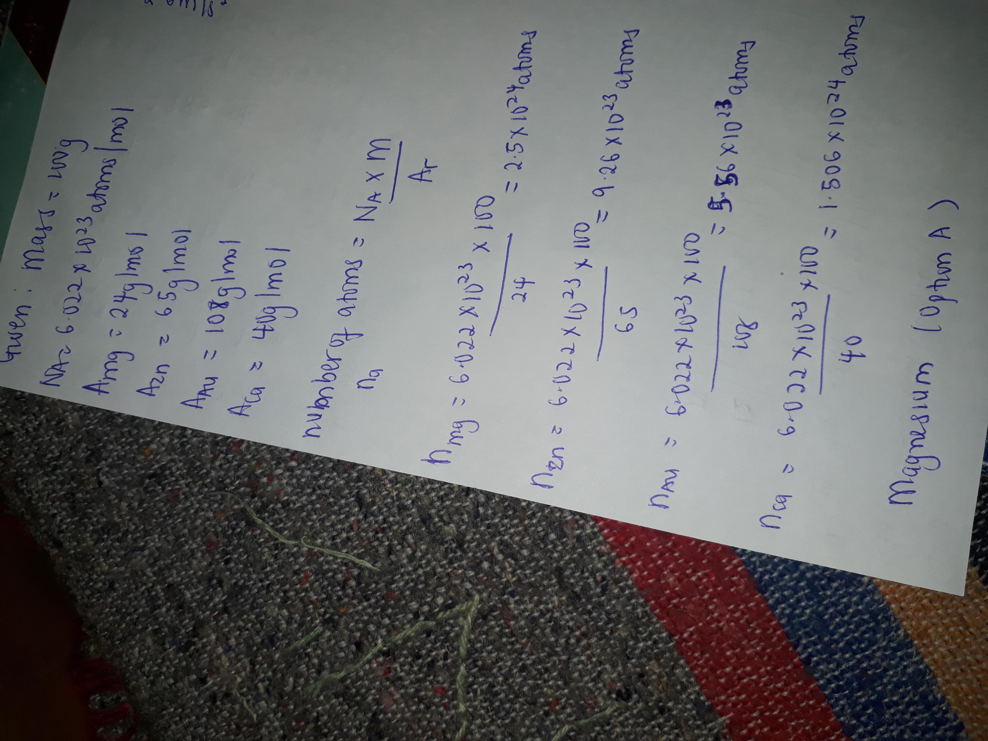 Which of the following 100.0-g samples contains the greatest number of atoms?a.Magnesiumb.Zincc.Silverd.Calciume.All samples con