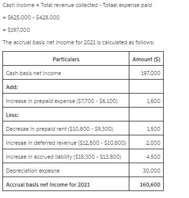 Haskins and Jones, Attorneys-at-Law, maintains its books on a cash basis. During 2021, the law firm collected $610,000 for services rendered to its clients and paid out $425,000 in expenses. You are able to determine the following information about accounts receivable, prepaid expenses, deferred service revenue, and accrued liabilities: January 1, 2021 December 31, 2021 Accounts receivable $ 75,000 $ 67,000 Prepaid insurance 5,800 7,100 Prepaid rent 10,500 9,600 Deferred service revenue 10,500 12,200 Accrued liabilities (for various expenses) 13,500 17,700 In addition, 2021 depreciation expense on office equipment is $28,500. Required: Determine accrual basis net income for 2021.