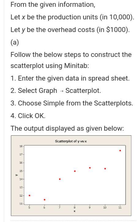 veness, many budgets are flexible, including allowances for the effect of variation in uncontrolled variables. For example, the costs and revenues of many production plants are greatly affected by the number of units produced by the plant during the budget period, and this may be beyond a plant manager's control. Standard cost-accounting procedures can be used to adjust the direct-cost parts of the budget for the level of production, but it is often more difficult to handle overhead. In many cases, statistical methods are used to predict or forecast overhead from the level of production using historical data. As a simple example, consider the historical data for a certain plant. Enter the data into EXCEL and analyze it to answer the following items. Production (in 10,000) units: 5 6 7 8 9 10 11 Overhead costs (in $1,000): 13 11.4 13 16 15.7 15.3 17.1 (a) Construct a scatterplot of y versus x. WebAssign Plot WebAssign Plot WebAssign Plot WebAssign Plot Correct: Your answer is correct. (b) State the model equation. PRODUCTION = β0 + β1OVERHEAD OVERHEAD = β1PRODUCTION OVERHEAD = β0 + β1PRODUCTION PRODUCTION = β1 + β0OVERHEAD OVERHEAD = β1 + β0PRODUCTION PRODUCTION = β1OVERHEAD Correct: Your answer is correct.