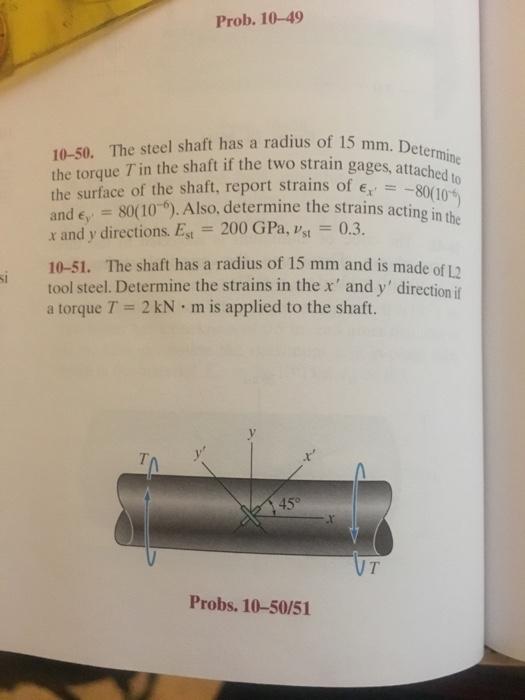 The shaft has a radius of 15 mm and is made of L2 tool steel. Determine the strains in the x' and y' direction if a torque T = 2 kN-m is applied to the shaft.
