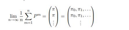 That is, when we average the m-step transition matrices, each row converges to the vector of  stationary probabilities π = (π0, π1, . . .). The i th row refers to the intial condition X0 = i in  (4), and for each such fixed row i, the j th element of the averages converges to πj . A nice way of interpreting π: If you observe the state of the Markov chain at some random  time way out in the future, then πj is the probability that the state is j.  To see this: Let N (our random observation time) have a uniform distribution over the  integers {1, 2, . . . n}, and be independent of the chain; P(N = m) = 1/n, m ∈ 2, . . . n}.  Now assume that X0 = i and that n is very large. Then by conditioning on N = m we obtain  (see image 2)
