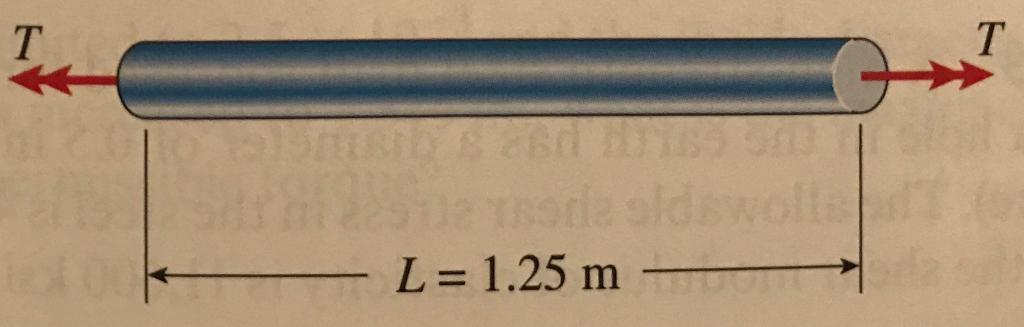 solid copper bar of circular cross section has length L 5 1.25 m and shear modulus of elasticity G 5 45 GPa. The bar is designed to carry a 250 N m? torque acting at the ends. If the allowable shear stress is 30 MPa and the allowable angle of twist between the ends is 2.58