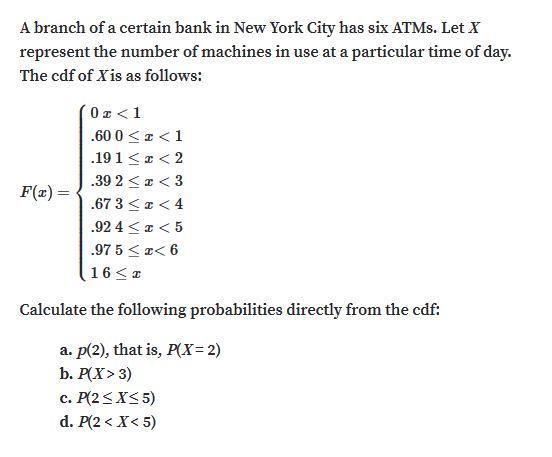 A branch of a certain bank has six ATMs. Let X represent the number of machines in use at a particular time of day. The cdf of X