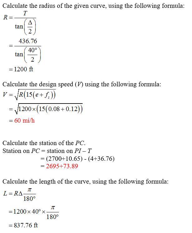 e: 40 degrees, tangent length = 436.76 ft, station of PI: 2700+10.65, fs = 0.12, e = 0.08. Determine: (a) design speed (b) station of the PC (c) station of the PT (d) deflection angle and chord length to the first 100 ft station