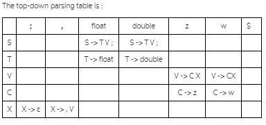 le, and terminates with a semicolon. It is possible to declare multiple variables separated by commas in one statement. The following statements present examples, float z; double z, w; The following partial grammar represents the specification for C++ style variable declaration. In this grammar, the letters z and w are terminals that represent two variable names. The non-terminal S is the start symbol. S=TV; V=CX X = , VIE T = float double C = z w 1 - Determine Nullable values for the LHS and RHS of all rules. Please note, your answer includes all Nullable functions for LHS and RHS, in addition to the resulting values. (25 points)