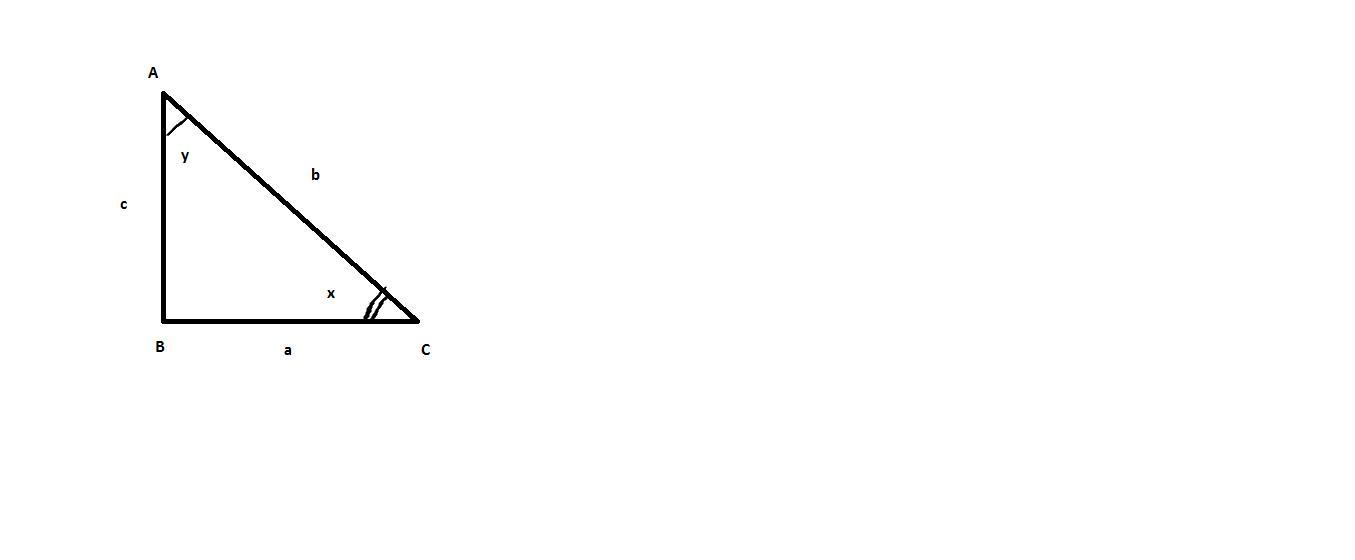 A right triangle is shown. The hypotenuse has length b. The angle opposite to side a is y and the angle opposite to side c is x.