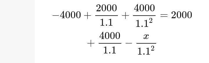 investment of X at time 2. The investment pays 2000 at time 0 and 4000 at time 1. The net present values of the two projects are equal at an interest rate of 10%. Calculate X.