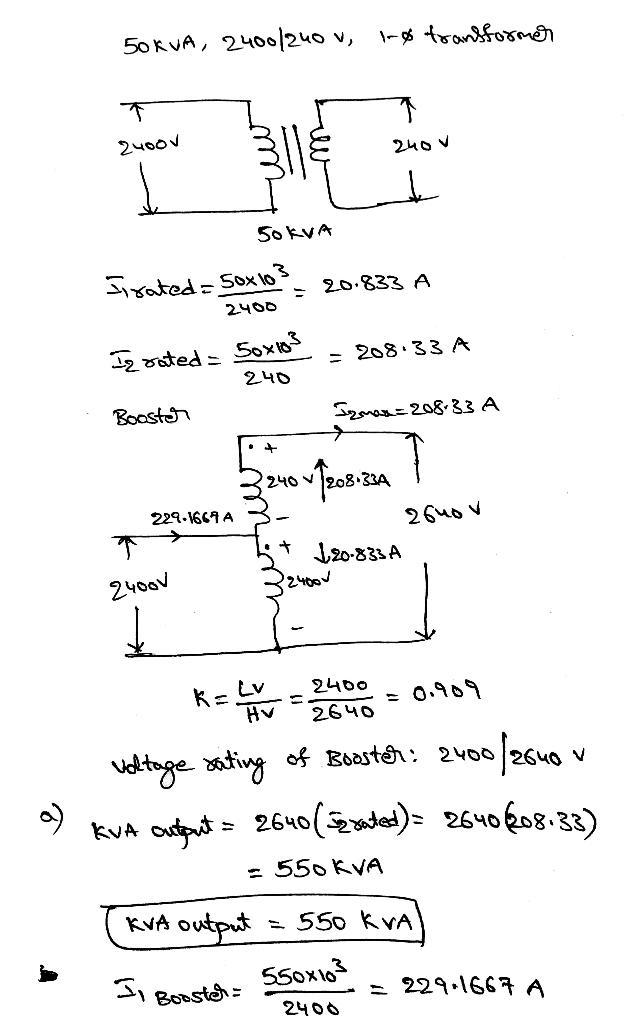 A 50 kVA, 2400/240 V, 1-Φ transformer is connected to act as a booster from 2400 to 2640 V. Without exceeding the rated current