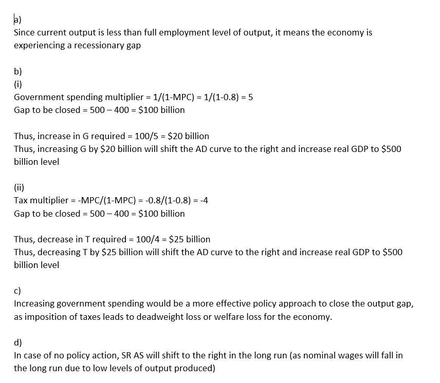 (ii) If instead Newland’s government changes taxes without changing government spending, calculate the minimum change and indicate the direction of change in taxes required to shift the aggregate demand curve to close the output gap. Show your work.