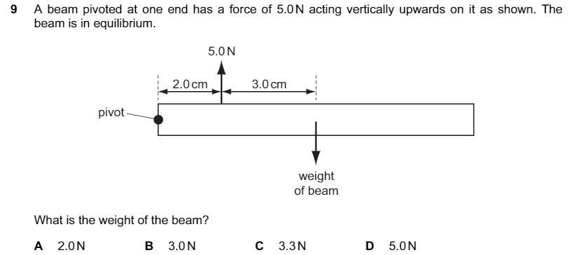 A beam pivoted at one end has a force of 5.0N acting vertically upwards on it as shown. the beam is in equilibrium.