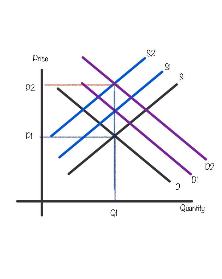 It has been assumed both demand and supply make equal shifts and that PES is equal to PED for peanut butter. Thus, as depicted in the diagram, the quantity of peanut butter will remain the same (Q1), however, the price would rise dramatically from P1 to P2.