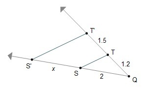 \dfrac{SQ}{S'Q}=\dfrac{TQ}{T'Q}\\\\\\\Rightarrow \dfrac{SQ}{SQ+S'S}=\dfrac{TQ}{TQ+TT'}\\\\\\\Rightarrow \dfrac{2}{2+x}=\dfrac{1.2}{1.2+1.5}\\\\\\\Rightarrow \dfrac{2}{2+x}=\dfrac{1.2}{2.7}\\\\\\\Rightarrow \dfrac{2}{2+x}=\dfrac{12}{27}\\\\\\\Rightarrow 54=24+12x\\\\\Rightarrow 12x=54-24\\\\\Rightarrow 12x=30\\\\\Rightarrow x=2.5.