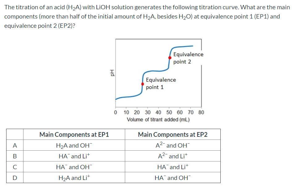The titration of an acid (H2A) with LiOH solution generates the following titration curve. What are the main components (more th